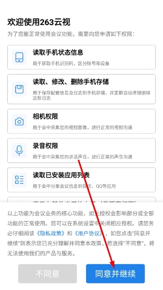 1、在【263云视】的权限申请页面,仔细阅读权限说明内容后,点击【同意并继续】按钮,以此来获取该功能正常运行所需的权限。