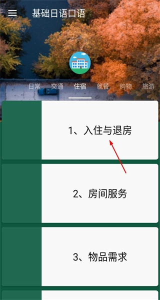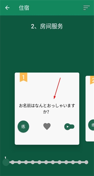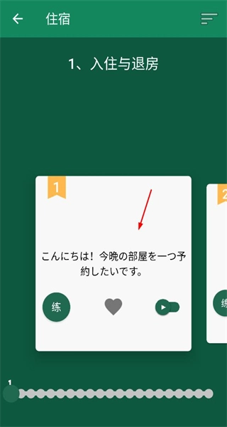 2、进入入住与退房的住宿用语页面,查看对应的日语句子,可点击“练”按钮进行练习,也可通过播放按钮收听发音。