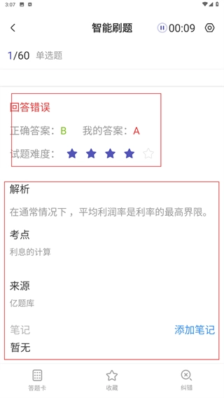 4、提交答案后,可查看相关反馈:若回答有误,能查看【正确答案】【解析】等内容,了解对应的考点(例如“利息的计算”),以此帮助巩固知识。