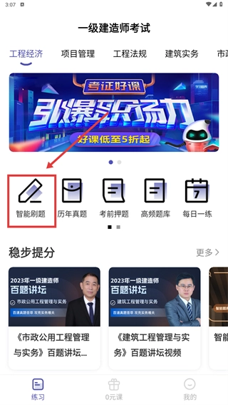 在一级建造师考试的学习界面中,找到并点击【智能刷题】的功能入口,进入刷题模块后,就能选择对应的科目开展练习。
