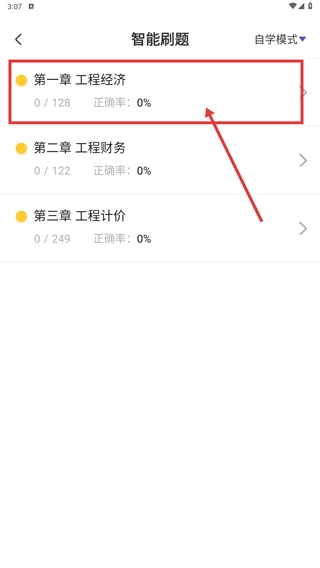 2、在智能刷题页面,选择具体章节(例如【第一章-工程经济】),进入该章节的题目练习界面后,就能看到该章节的题目总数以及答题正确率。