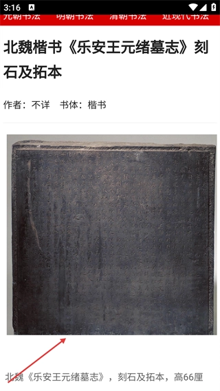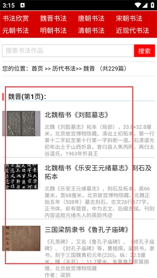 进入书法欣赏页面后,能看到【魏晋书法】【唐朝书法】等按朝代划分的标签,还可以搜索【书法作品】。