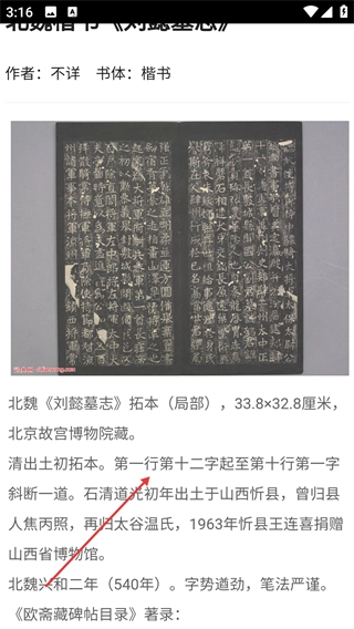 2、点击【北魏楷书《刘懿墓志》】即可进入详情页面,在这里能查看【作者-不详】【书体-楷书】,以及拓本尺寸、收藏情况和出土流转的详细信息。