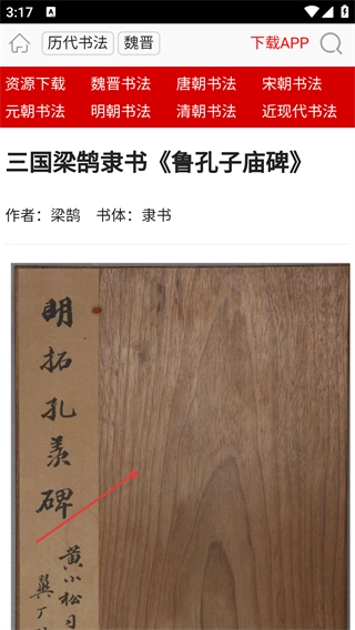 4、点击【三国梁鹄隶书《鲁孔子庙碑》】进入详情页面,就能看到【作者-梁鹄】【书体-隶书】,以及该碑的别名等相关信息。
