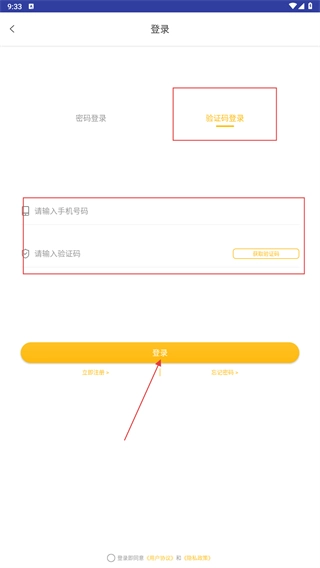 4、若选择【验证码登录】方式,先输入手机号码,点击【获取验证码】按钮,待收到验证码后将其填入对应输入框,最后点击【登录】按钮,即可完成登录流程。
