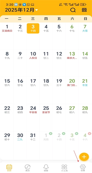 1、启动软件后,进入主页面,查看2025年12月的日期与节日信息,随后点击设置按钮进入相应的设置界面。