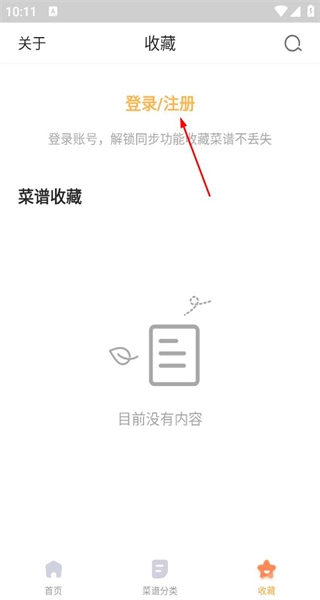 2、进入收藏页面后,会看到登录注册提示以及菜谱收藏板块,点击该提示即可进入对应的登录注册操作页面。