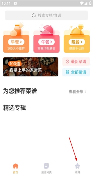 打开软件后,首页设有早餐、午餐、晚餐的分类以及推荐菜谱内容,点击底部的收藏按钮即可进入对应的收藏页面。