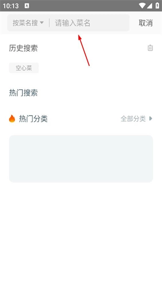 4、回到软件的首页,点击搜索栏进入搜索页面,查看历史搜索和热门搜索的内容,为输入菜名进行搜索做准备。