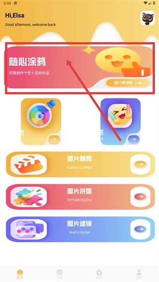 1、在首页找到【随心涂鸦】模块,点击其中的【去涂鸦】按钮,即可进入涂鸦创作界面,开启个性化绘画创作。