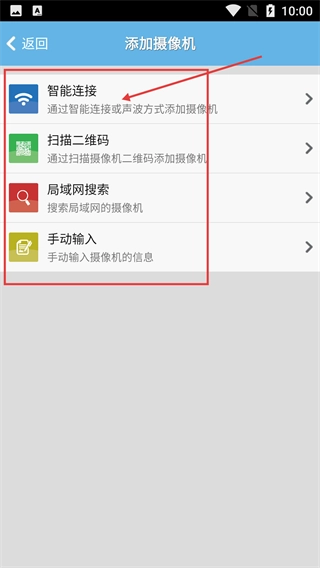 2、进入【添加摄像机】页面后,可选择【智能连接】、【扫描二维码】、【局域网搜索】、【手动输入】这四种添加方式,根据实际需求选择对应的方式进行添加操作。