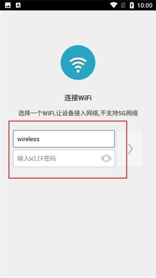 4、在【连接WiFi】页面,选择目标WiFi(例如【wireless】),输入该WiFi对应的密码(注意不支持5G网络),操作完成后设备就能接入网络了。