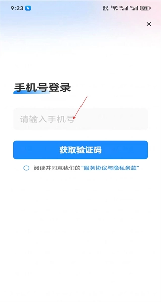 3、进入账号登录页面,输入账号,点击获取验证码,勾选“阅读并同意服务协议与隐私条款”。