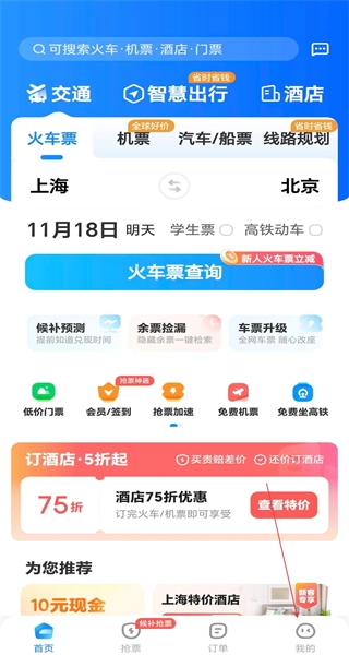 1、进入首页后,选择出发地为上海、目的地为北京,选定日期为11月18日,点击火车票查询按钮,此外还能参与新人优惠等相关服务。