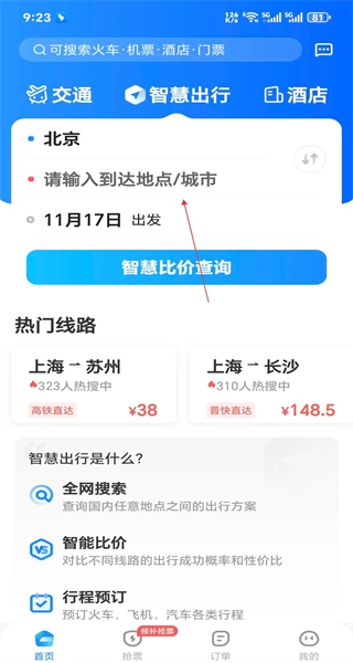 4、进入线路规划页面后,输入目的地,选择11月17日作为出发日期,点击智慧比价查询按钮,此外还能查看热门线路等内容。