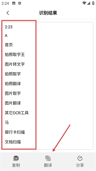 2、文字识别完成后,在识别结果页面可以查看提取出的内容,也能点击底部的【翻译】按钮来进行文字翻译操作。