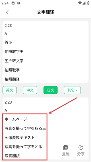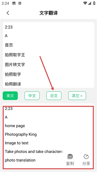 进入文字翻译页面后,你可以选择目标语言(例如【日文】),系统会自动把提取到的文字翻译成相应语言的内容。