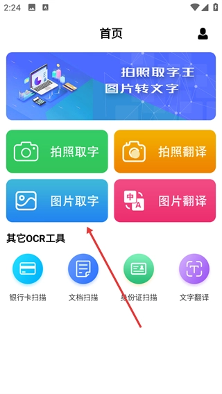 1、在首页点击【图片取字】功能,既可以上传图片提取文字,也能够使用【拍照取字】【拍照翻译】等OCR相关工具。