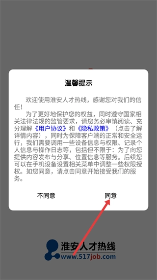 在使用【淮安人才热线】之前,需要先阅读【用户协议】与【隐私政策】,随后点击弹窗里的【同意】按钮,授权设备信息等相关权限,这样才能开启服务的使用。