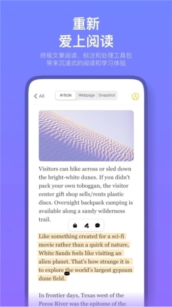 -标注漫游功能,在App里你能通过滑动卡片的方式,回顾自己标注过的精彩文字,就连AI自动智能高亮的精彩内容也能一并查看。不管是用来辅助学习、强化记忆,还是快速了解那些没读过的文章里的精华片段,标注漫游都能让你的学习过程变得更轻松、更有趣。