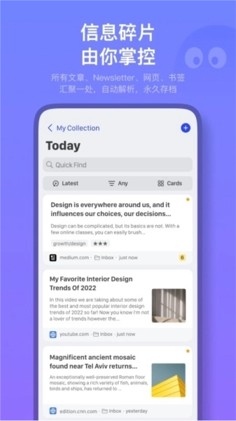 在媒介与算法的信息投喂下,我们常被各类资讯裹挟,而Cubox就像一座私人小岛。在这里,你能隔绝干扰,专注于更精简、优质的内容,在长期的阅读思考中稳步成长。即使不刻意整理,智能列表也会依据你设定的规则自动筛选、归类收藏,让信息始终井井有条。
