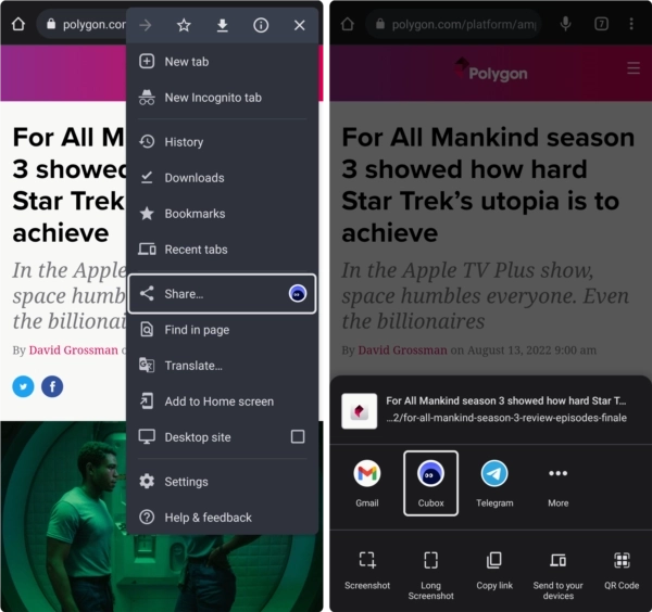 你可以在其他App里,借助系统自带的分享菜单功能,把想要收藏的内容分享到Cubox来完成收藏操作。
