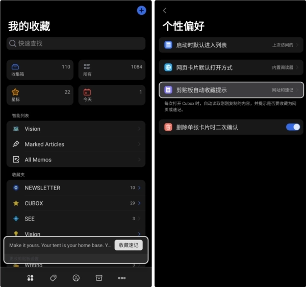 把文本或者链接复制后粘贴到Cubox里,它就会自动识别剪贴板中的内容,并且弹出收藏提示。