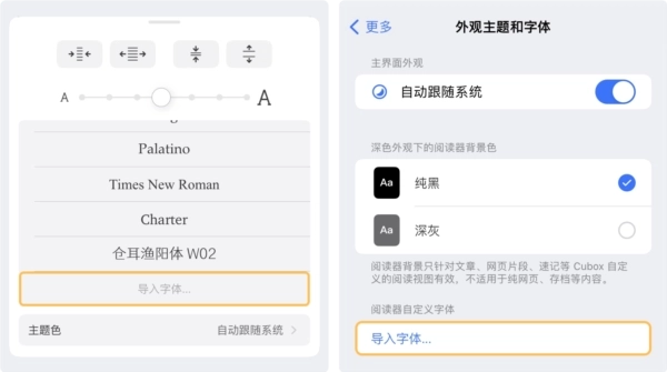在阅读器样式菜单A,或是App的更多选项、网页版的偏好设置>外观主题和字体里,就能导入字体…。