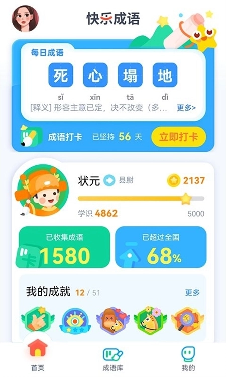 1.每日一练的打卡学习模式,鼓励用户坚持每天练习积累成语,助力培养良好的成语学习习惯。