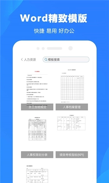 在主界面上,用户能看到各类分类模板,像个人简历、人力资源、合同范文、财务管理、总结报告之类的都包含在内。