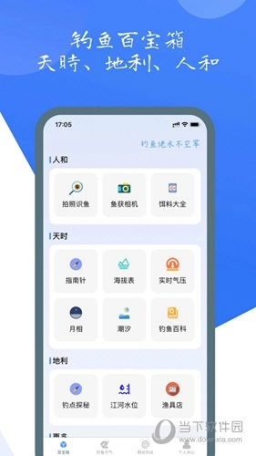 天时相关工具:钓鱼爱好者适用的指南针、海拔测量仪、实时气压监测仪、月相观测工具、潮汐信息查询功能以及卫星地图。