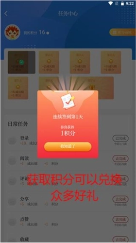 3、系统会提示用户签到成功,签到能获取积分,积分可在积分商城兑换物品。