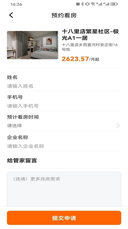 6、选定心仪房源后,能直接在线填写预约时段和联系信息,以便和房主或管家迅速敲定线下看房事宜。