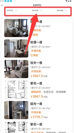 3、在房型列表页面,可借助租金筛选功能来精准查找符合需求的房源。