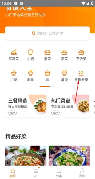 1、启动食谱大全应用,进入主界面后,浏览各类菜品的分类情况,接着点击“全部分类”选项,进入对应的分类页面。