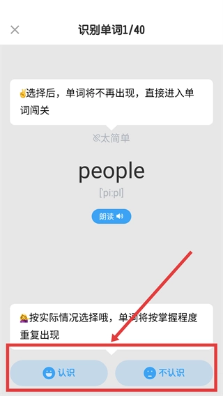 4、进入【识别单词1/40】界面,先查看【people】的读音,再根据自身掌握情况,选择【认识】或【不认识】按钮,以此推进练习。