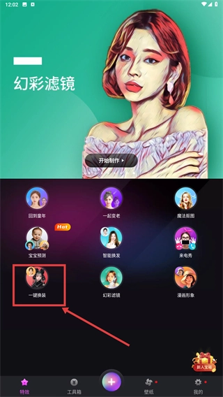 2、在主界面的特效功能区,找到并点击“一键换装”选项,进入对应的换装素材选择页面。