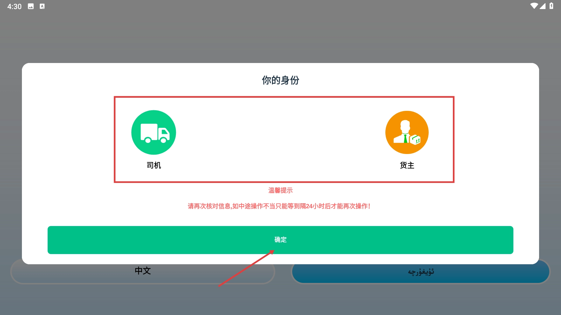 2、在身份选择弹窗中,选择【司机】或【货主】身份后,点击【确定】按钮即可完成身份选择。