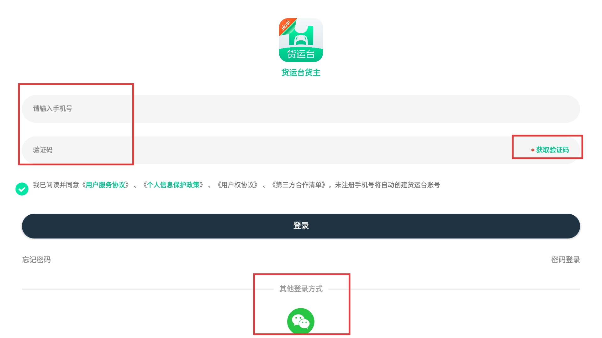 3、选择验证码登录方式时,在【请输入号】处填写信息,点击【获取验证码】并填入收到的验证码,勾选相关协议后点击【登录】;此外也可以选择第三方登录方式。