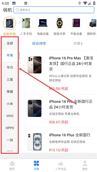 2、进入全新分类页面后,点击左侧的【苹果】选项,即可筛选出苹果品牌的租赁商品,帮助用户更精准地查找目标设备。