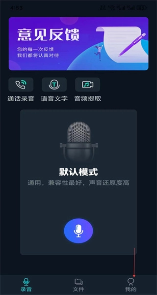 1、启动软件后,进入录音界面,了解默认模式的相关说明,点击“我的”选项进入个人中心界面。