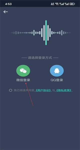 3、进入登录界面,选择微信登录方式,准备勾选协议后完成账号登录操作。