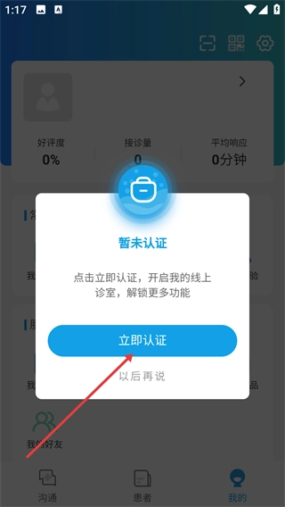 3、在提示弹窗中点击【立即认证】,进入医生认证页面,需填写姓名、身份证号等信息。