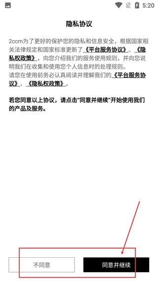 1、在【2ccm】的【隐私协议】页面,点击【同意并继续】按钮,就能进入应用流程。