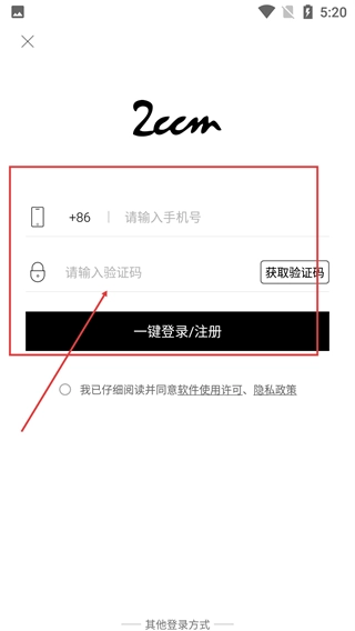 3、在【2ccm】的登录界面,要填写【号】、获取并输入【验证码】,然后点击【一键登录/注册】按钮,以此完成账户的登录或注册操作。