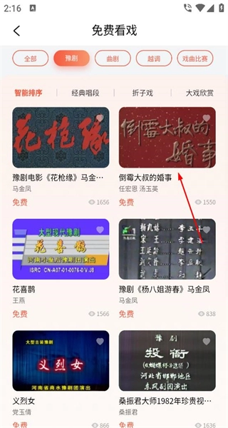 2、点击“看戏”选项,即可查看全部分类,选择“豫剧”分类后,就能浏览该分类下对应的剧目展示卡片,卡片上包含剧目名称等相关信息。