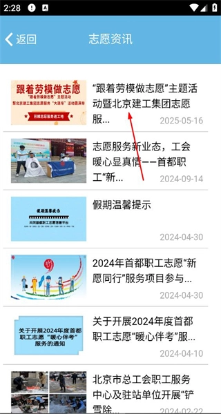 2、进入志愿资讯页面后,浏览多条与志愿相关的资讯内容,从中选择“跟着劳模做志愿”主题活动的资讯,点击进入其详情页面。