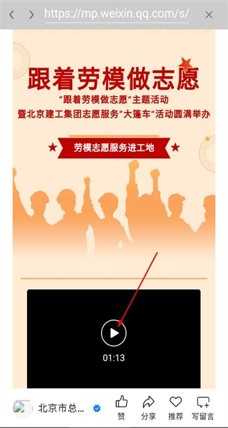 3、进入该资讯详情页,查看活动主题与视频,点击视频播放按钮,观看活动相关内容。