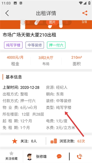 4、进入出租详情页面后,能够查看房源的租金、面积、装修等基本信息,了解该写字楼出租的具体内容。