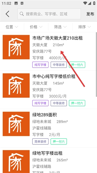2、在商铺写字楼页面点击【写字楼出租】选项,进入对应的写字楼出租房源列表页面,查看相关房源信息。